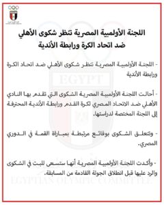 – اللجنة الأولمبية المصرية تنظر شكوى الأهلي ضد اتحاد الكرة ورابطة الأندية