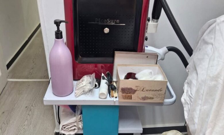 وأوضح الدكتور حسام عبدالغفار، المتحدث الرسمي لوزارة الصحة والسكان، أن إدارة العلاج الحر بمحافظة القاهرة بالتعاون مع وزارة الداخلية ممثلة في مباحث مصر الجديدة قامت بالمرور على العيادة المذكورة، وتبين أنها تعمل بدون ترخيص بالمخالفة لقانون رقم 153 لسنة 2004، والخاص بنتظيم عمل المنشآت الطبية، كما تم العثور على جهاز ليزر وجهاز لتنظيف البشرة غير مرخصين، بالإضافة إلى علب فيلر وبوتكس بالمخالفة لقانون الصيدلة وقرار وزير التموين.