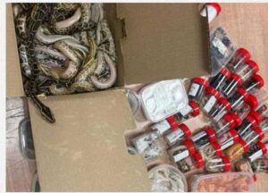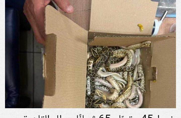 – 65 ثعبانًا، بينها 4 من نوع «كوبرا بخّاخ» باللونين الأحمر والأسود، والبقية أنواع نادرة وخطرة.