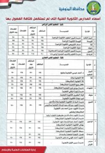 حيث وافق محافظ المنوفية علي النزول بمجموع درجات القبول بالصف الأول الثانوي ( العام ، الرياضي ) من 230 درجة الى 227 درجة ، الثانوي العام ( الخاص ) من 215 درجة الي 210 درجة ، الثانوي العام ( خدمات ) من 210 درجة إلي 207 درجة ، وذلك بهدف إستكمال الكثافات الطلابية وتخفيف العبء عن كاهل أولياء الأمور .