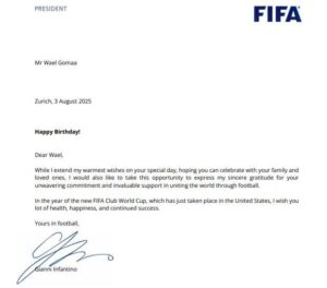 وقال إنفانتينو في تهنئته لصخرة دفاع منتخب مصر السابق : عيد ميلاد سعيد عزيزي وائل.. أتقدم إليك بأحرّ التهاني في يومك المميز، آملاً أن تحتفل به مع عائلتك وأحبائك، كما أود أن أغتنم هذه الفرصة لأعرب عن خالص امتناني لالتزامك الراسخ ودعمك القيّم في توحيد العالم من خلال كرة القدم.. في عام كأس العالم للأندية FIFA الجديدة، التي أُقيمت مؤخراً في الولايات المتحدة، أتمنى لك دوام الصحة والسعادة والنجاح.. مع أطيب التمنيات”