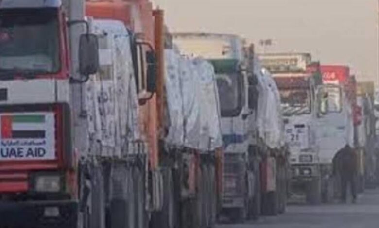 عبور 21 شاحنة مساعدات إماراتية ضمن القافلة الـ15 للفلسطينيين بقطاع غزة