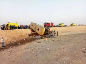 وعلى الفور تم الدفع بعدد من سيارات الإسعاف إلى موقع التصادم، وبالمعاينة الأولية والفحص تبين انقلاب أتوبيس يحمل رقم “964 ي ف د ” على الطريق الصحراوي الغربي ما أسفر عن مصرع شخصان وإصابة 33 آخرين، كما تم رفع آثار الحادث من الطريق لتيسير الحركة المرورية.