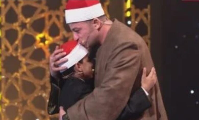 الشيخ طه النعمانى يقبل رأس المتسابق محمد القلاجى بـ دولة التلاوة