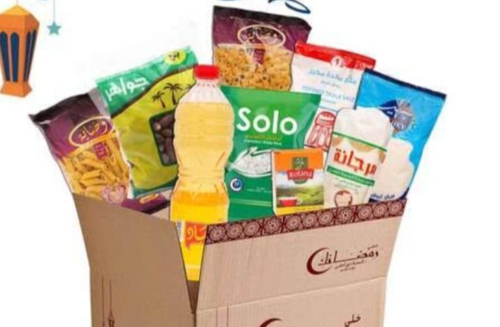 كرتونة بسعر 300 جنيه تضم 10 أصناف “2 كيلو سكر – 2 كيلو أرز – صلصة 300 جرام – 2 مكرونة أنواع 350 جرام – زيت 700 ملي – 2 شاي 40 جرام – 2 ملح 300 جرام – كيلو بلح – فول 500 جرام – سمنة 350 جرام “.