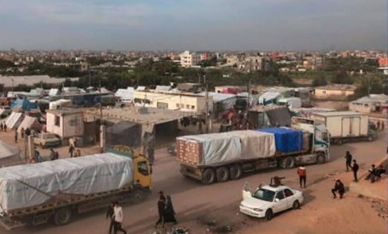 أوضحت أن المساعدات تشمل الطحين والمواد الغذائية والمعدات الطبية والأدوية، مشيرة إلى أن الشاحنات، التي تنقل المساعدات قد خضعت لتفتيش أمني صارم من قبل أفراد سلطة المعابر البرية.